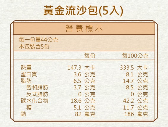 成分:麵粉、水、鹹蛋黃(鴨蛋、鹽)、奶油、糖、煉乳(糖、乳粉、水、麥芽糖)、鮮乳、卡士達粉[玉米澱粉、鹽、著色劑(食用黃色四號、食用黃色五號、食用紅色七號)、香料]、奶粉、鮮奶油、糯米粉、碳酸氫鈉、磷酸二氫鈣、酵母粉、明膠、米酒、食用鹼(無水碳酸鈉)
